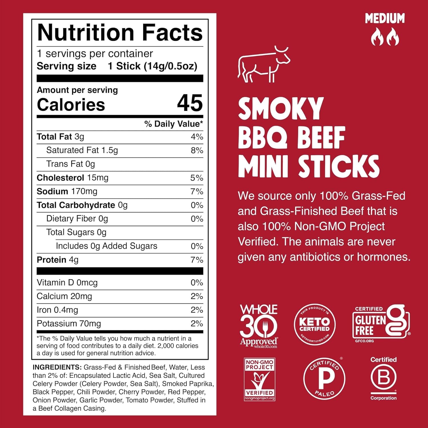 Total Snackage: Each satisfying 0.5 oz Smoky BBQ Beef Jerky snack stick is made with high quality, real ingredients, has 4 grams of protein, zero sugar, and just 45 calories. The perfect snack you can feel good about anytime, anywhere.