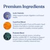 Inulin, Spinach Leaf Extract, Probiotic Blend. Bacillus subtilis DE111, Lactobacillus acidophilus, Lactobacillus plantarum, Bacillus coagulans, Bifidobacterium longum, Bifidobacterium animalis lactis