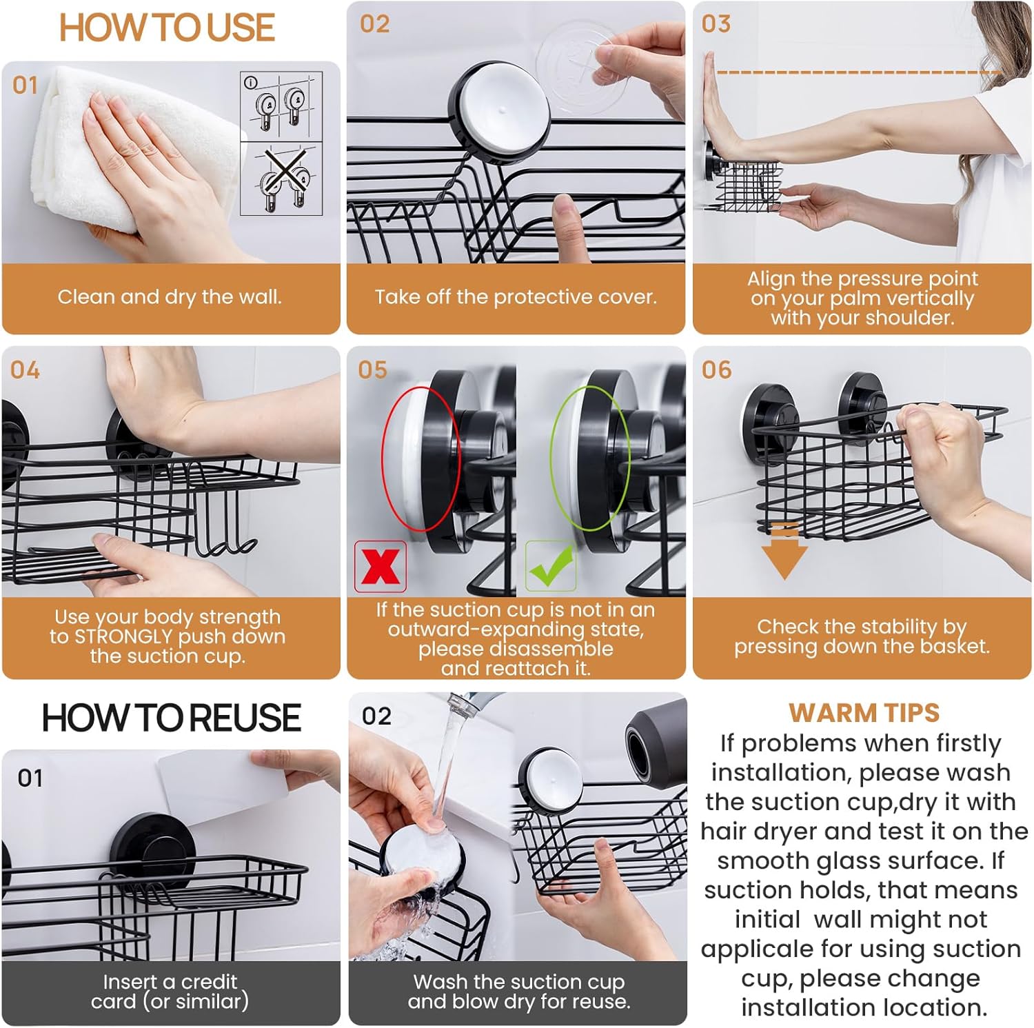 • Warm Tip: This shower organizer works best for non-porous, impervious, smooth surfaces such as glass, mirror, polished metal, stainless steel, plastic board, wall tile, grainy granite, etc. Please remind that don’t stick to a grout line. If problems when firstly installation, please wash the suction cup, dry it with hair dryer and test it on the smooth glass surface. If suction holds, that means initial wall might not applicable for using suction cup, please change installation location