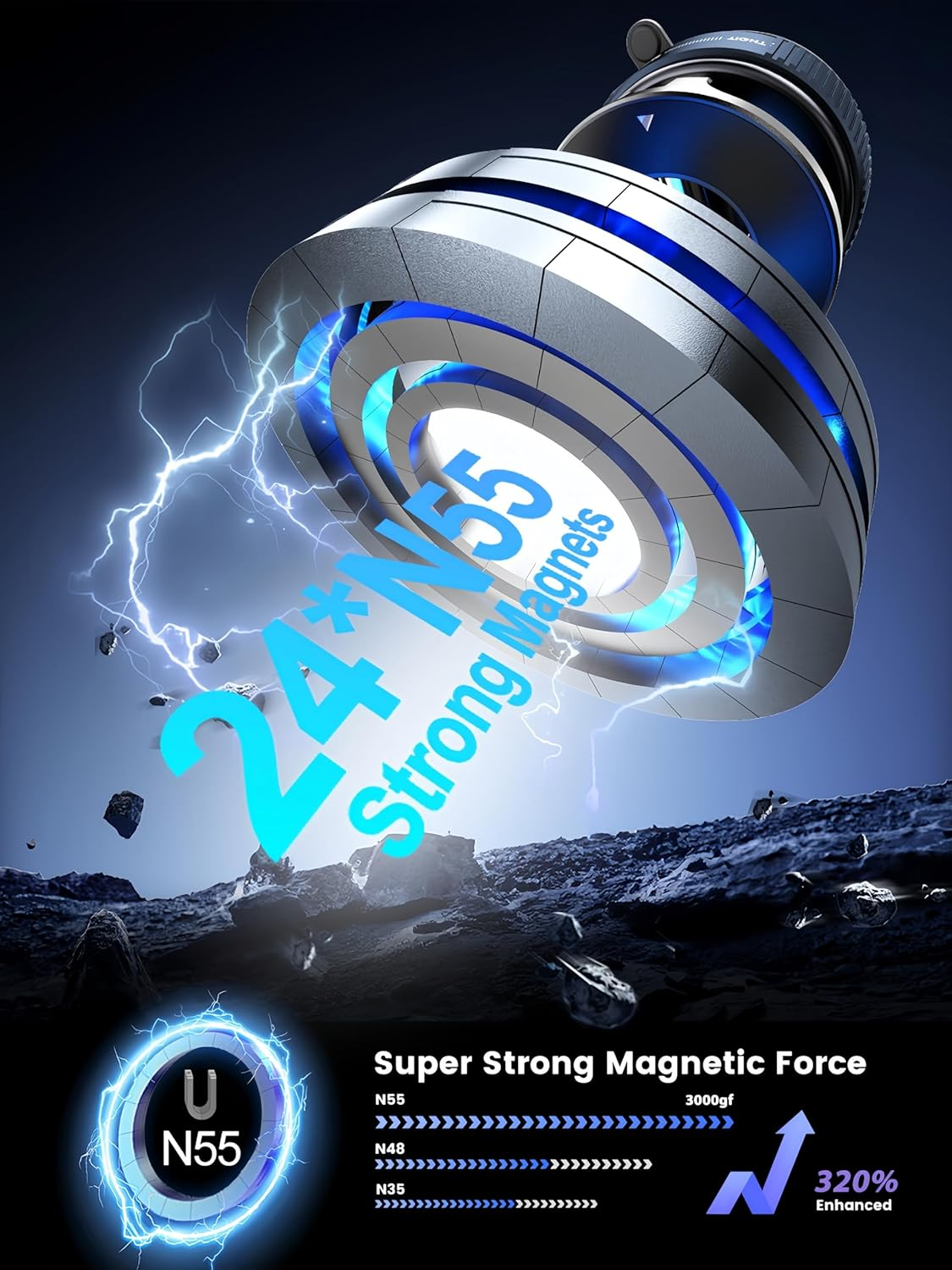 • 【Strong Suction】This vacuum magnetic phone holder features an upgraded 4-layer nano gel suction base with rotary vacuum-seal technology. Simply twist the dial to secure it firmly on flat surfaces like leather dashboards, windshields, center consoles, or side windows. Delivers 80% stronger hold than traditional push-style mounts, staying rock-solid even on bumpy roads. (Pro tip: Rinse the suction cup with water to restore its original grip if adhesion weakens).